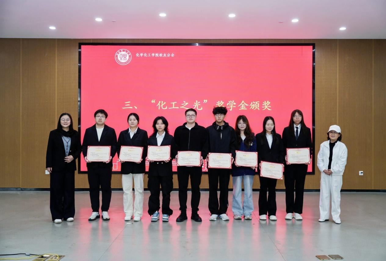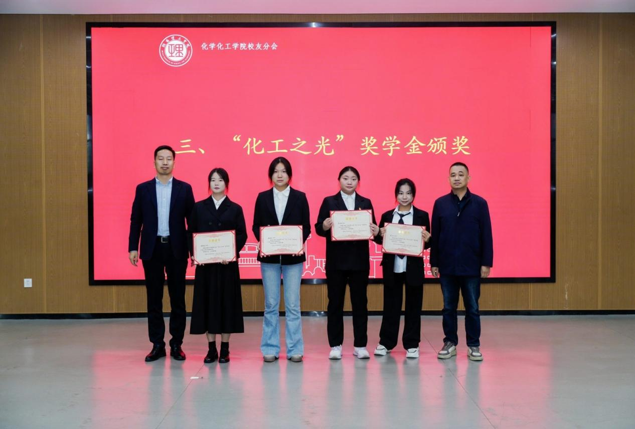仪式现场,汤福球宣读“化工之光”奖学金获奖名单,校友代表为获奖学生颁发荣誉证书。